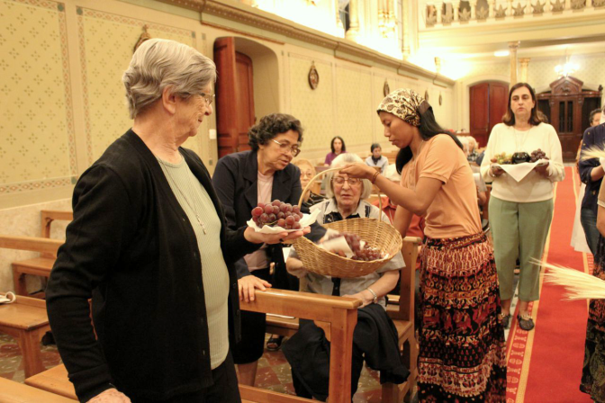 Um momento original foi a apresentação das oferendas: duas jovens em formação recolheram espigas de trigo e cachos de uvas espalhados pela assembleia. A Madre e a Inspetora, Irmã Alaíde Deretti, levaram ao altar os dons do pão e do vinho, enquanto a comunidade cantava: “Muitos grãos de trigo… muitos cachos de uva…”.