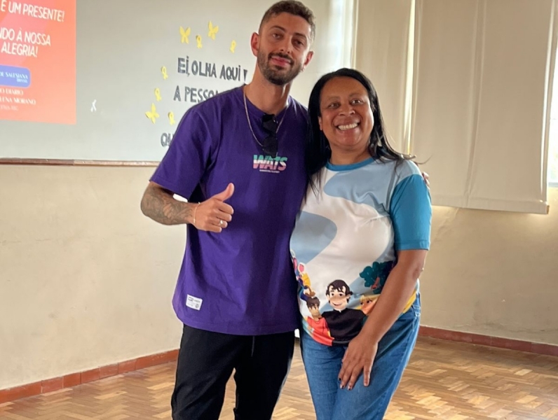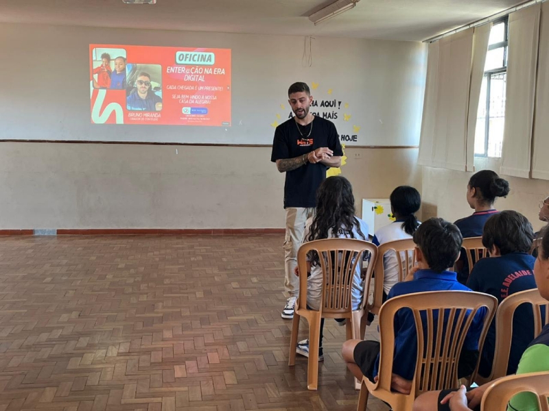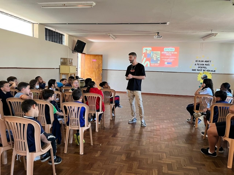Dia 06 - Hoje a Oficina Enter@ção na Era Digital recebeu uma visita super especial no turno da manhã! Conhecemos Bruno Miranda, @bruniinmiranda jovem criador de Reels da nossa cidade com 218 mil seguidores, que leva alegria através da sua arte. Com sua simpatia e simplicidade, ele encantou nossos educandos, que vêm refletindo sobre o mundo digital, perspectivas, inserção em nichos e educação digital. Seu jeito engraçado transborda alegria! Gratidão ao Bruninho Miranda pela presença e pelo carinho com todos nós! @bruniinmiranda